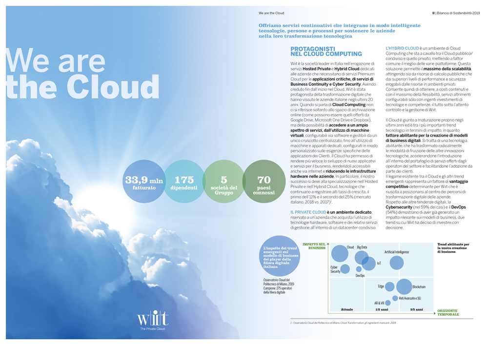 Raccontare il percorso di sostenibilità che Wiit ha intrapreso e che viene narrato nel primo Bilancio di Sostenibilità realizzato con il contributo di The European House-Ambrosetti (contributo scientifico e progetto editoriale) e con la partecipazione di 15 stakeholder tra clienti, investitori e partner.