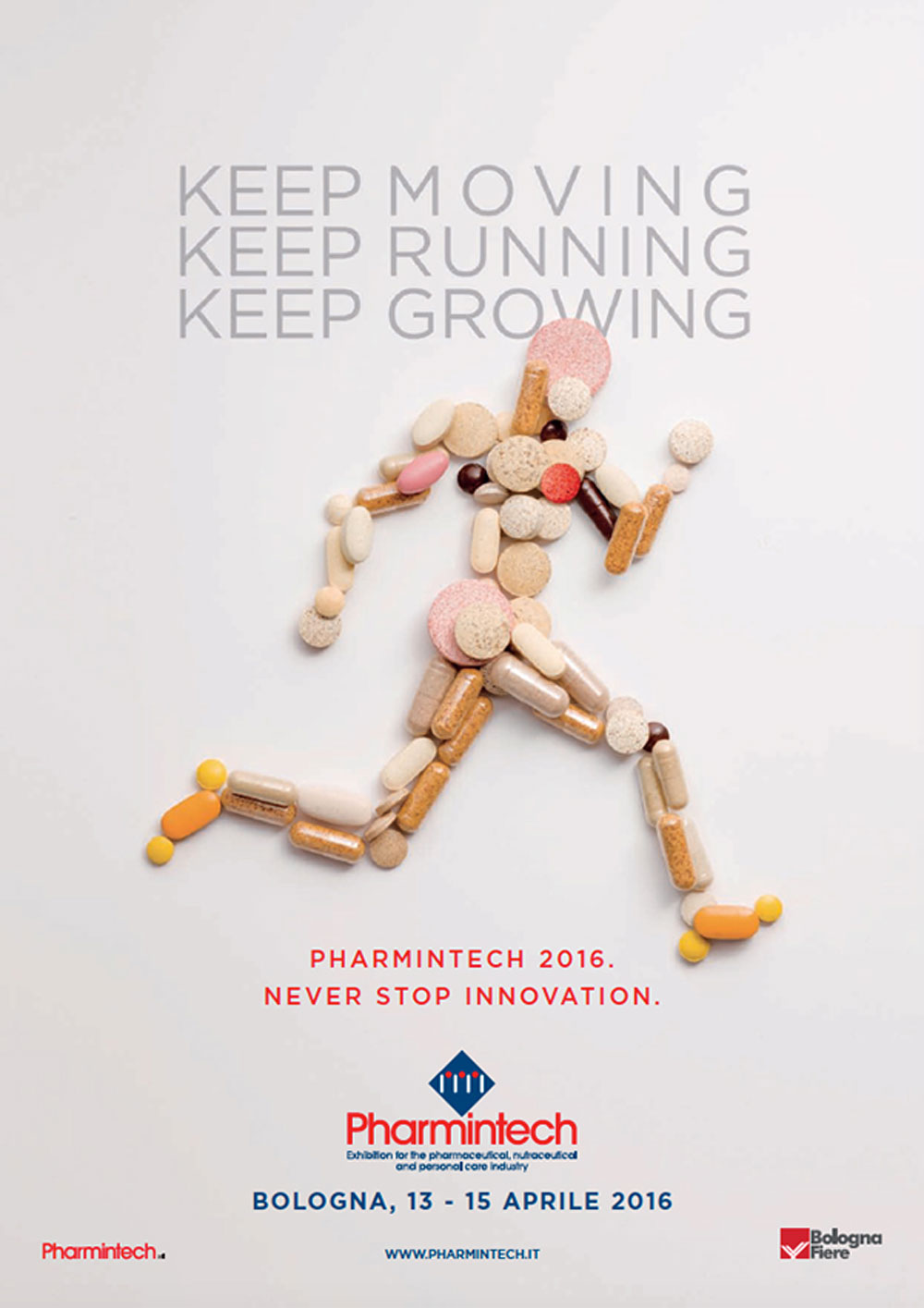 Il dinamismo è protagonista della campagna e di tutto il materiale di comunicazione. Pillole e compresse diventano i tasselli costituenti delle diverse immagini, dall’uomo che corre, simbolo della campagna, fino al cuore che batte, simbolo di una manifestazione che sta diventando, sempre di più, la piattaforma di riferimento per chi vuole crescere e cogliere nuove opportunità su scala internazionale.